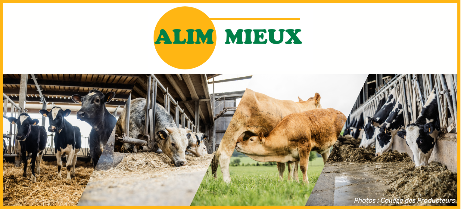 ALIM_MIEUX est un outil de rationnement développé sous Excel par l’ASBL Fourrages Mieux, destiné à concevoir des rations pour les bovins laitiers (vaches en lactation, vaches taries, génisses laitières) et viandeux (vaches allaitantes, taurillons, génisses de renouvellement, vaches de réforme). Partagé gratuitement aux membres de l'ASBL Fourrages Mieux, cet outil vise à renforcer l’autonomie décisionnelle des éleveurs en leur permettant de concevoir ou vérifier eux-mêmes les rations adaptées à leur troupeau.